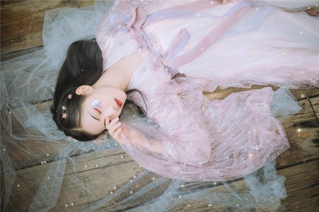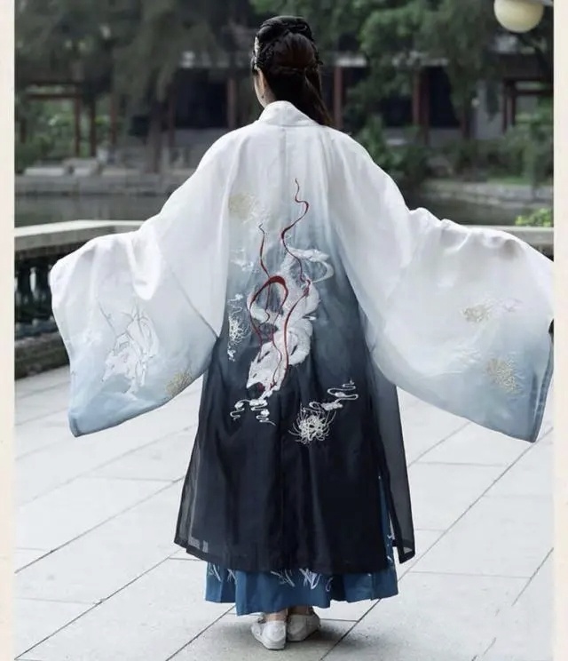 此款漢服面料是用輕柔的紗網,輕微的漸變色渲染加耀眼的亮片繡,微風吹來,
