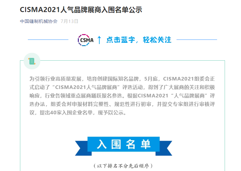 2021年9月26日至29日,2021中國國際縫制設(shè)備展覽會(huì)(CISMA2021)將在上海新國際博覽中心舉辦。