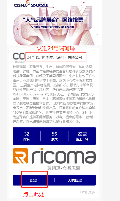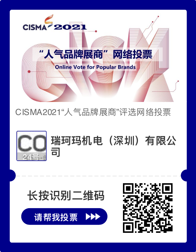 為了傳播品牌價(jià)值,擴(kuò)大品牌影響力,此次展會(huì)還設(shè)置了人氣品牌展商評(píng)選活動(dòng)。經(jīng)企業(yè)申報(bào)、專家組審查評(píng)議,CISMA2021組委會(huì)確定了42家入圍企業(yè),瑞珂瑪機(jī)電(深圳)有限公司成功入選,目前進(jìn)入網(wǎng)路投票階段。