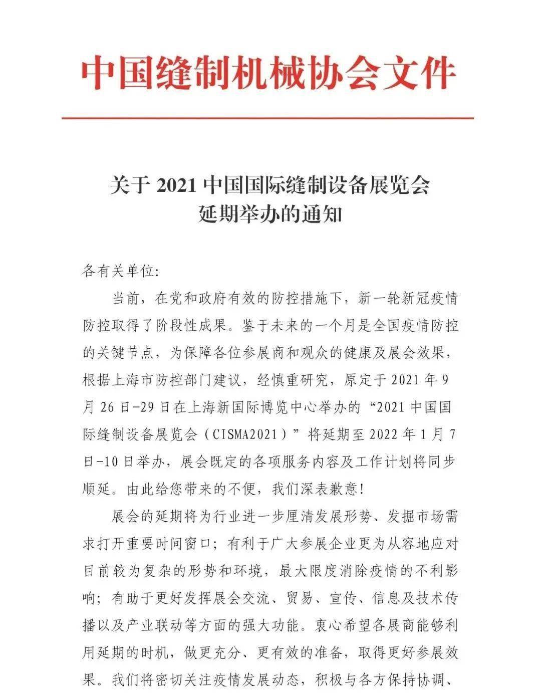 8月26日,中國縫制機械協(xié)會發(fā)布了《關于2021中國國際縫制設備展覽會延期舉辦的通知》,通知指出為保障參展商和觀眾的健康及展會效果,根據(jù)上海市防控部門的建議,經(jīng)慎重研究,原定于2021年9月26日-29日在上海新國際博覽中心舉辦的“2021中國國際縫制設備展覽會(CISMA2021)”將延期至2022年1月7日-10日舉辦。